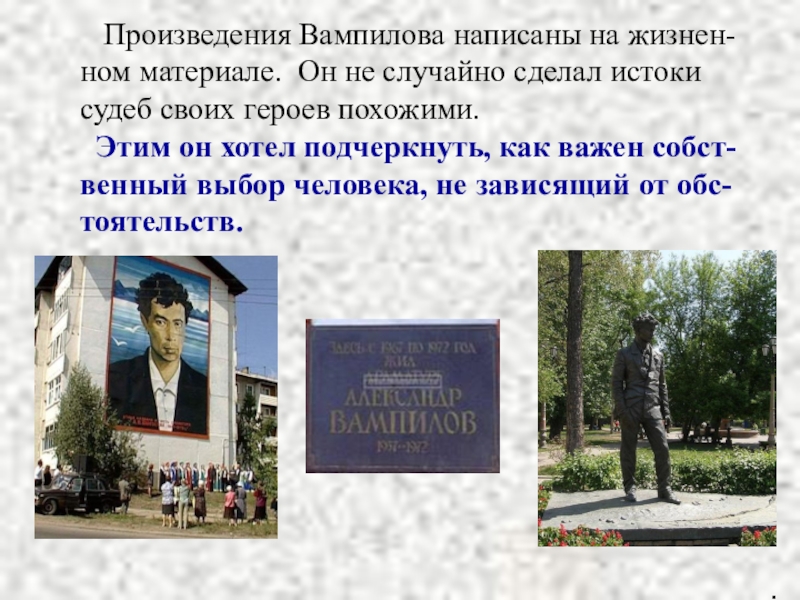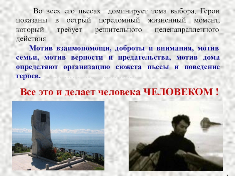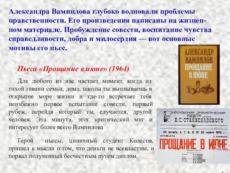Для любого из нас настает момент, когда из тихой гавани семьи, дома, школы ты выплываешь в открытое море жизни и где-то встречает тебя неизбежно первое испытание совести, первый рубеж, перейдя который ты, случается, другой человек. Эта минута, этот критический миг и интересует более всего Вампилова