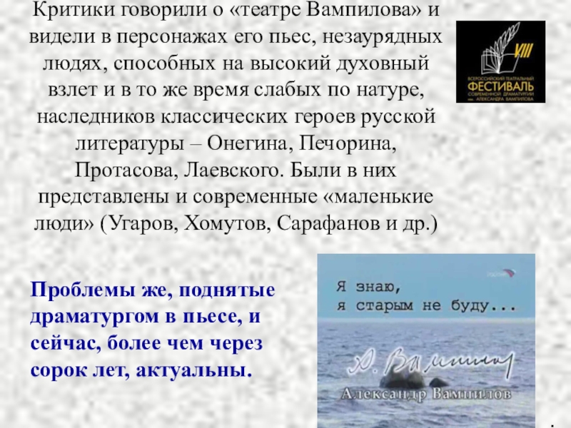 Проблемы же, поднятые драматургом в пьесе, и сейчас, более чем через сорок лет, актуальны.