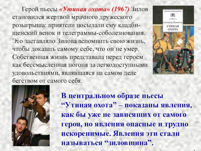 В центральном образе пьесы “Утиная охота” – показаны явления, как бы уже не зависящих от самого героя, но явления опасные и трудно искоренимые. Явления эти стали называться “зиловщина”.