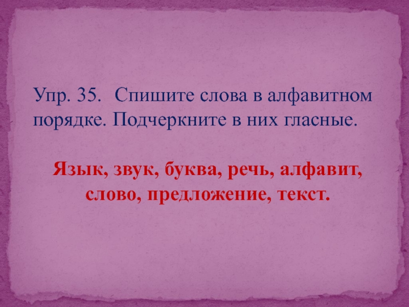 Слайд 10Упр. 35. Спишите слова в алфавитном порядке. Подчеркните в них гласные.