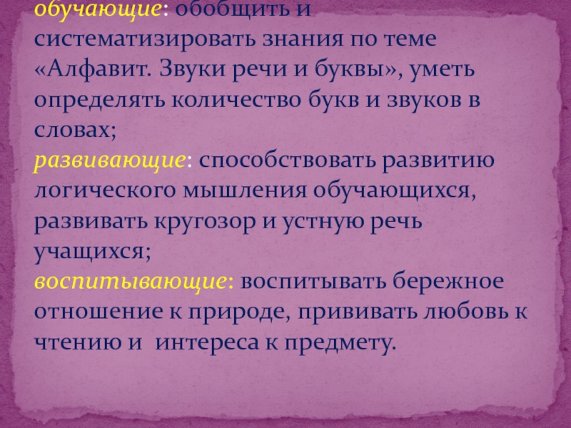 обучающие: обобщить и систематизировать знания по теме «Алфавит.