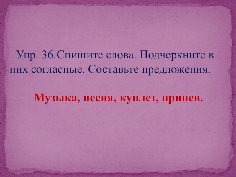 Слайд 12Упр. 36. Спишите слова. Подчеркните в них согласные. Составьте предложения.