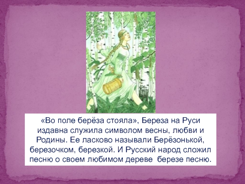 Слайд 11«Во поле берёза стояла», Береза на Руси издавна служила символом весны,