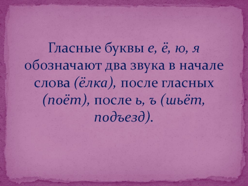 Слайд 6Гласные буквы е, ё, ю, я обозначают два звука в начале