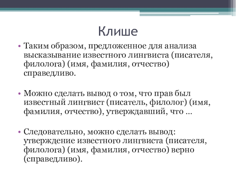 Следовательно, можно сделать вывод: утверждение известного лингвиста (писателя, филолога) (имя, фамилия, отчество) верно (справедливо).
