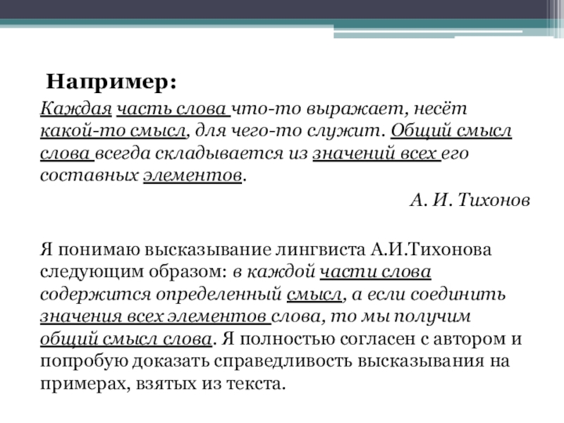 Я понимаю высказывание лингвиста А.И.Тихонова следующим образом: в каждой части слова содержится определенный смысл, а если соединить значения всех элементов слова, то мы получим общий смысл слова. Я полностью согласен с автором и попробую доказать справедливость высказывания на примерах, взятых из текста.
