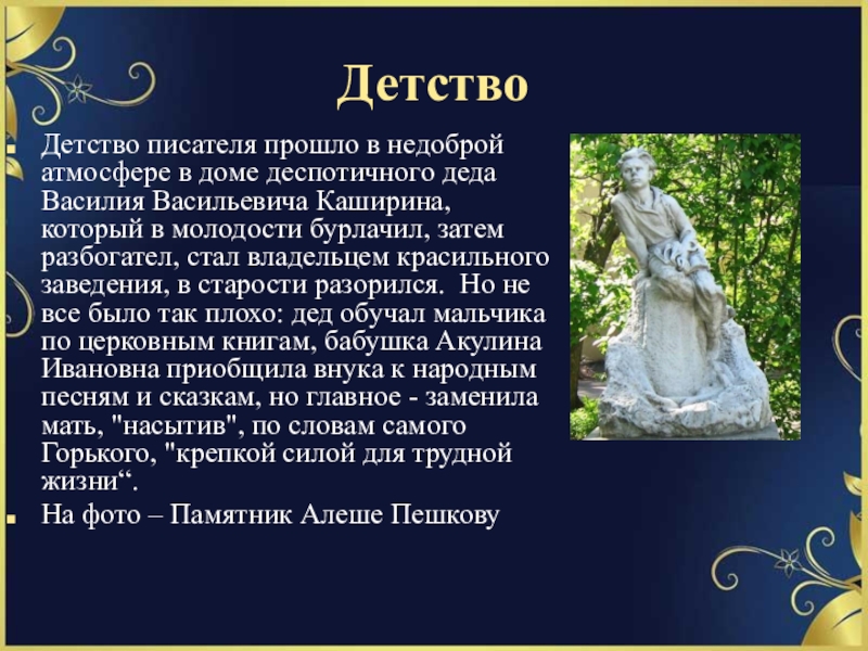 Васильевича Каширина, который в молодости бурлачил, затем разбогател, стал владельцем красильного заведения, в старости разорился. Но не все было так плохо: дед обучал мальчика по церковным книгам, бабушка Акулина Ивановна приобщила внука к народным песням и сказкам, но главное - заменила мать, "насытив", по словам самого Горького, "крепкой силой для трудной жизни“.