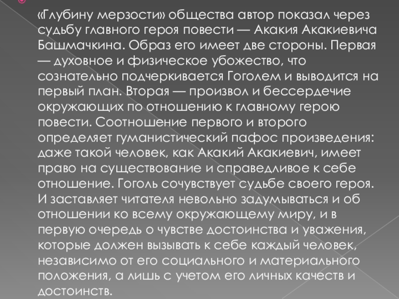 Акакия Акакиевича Башмачкина. Образ его имеет две стороны. Первая — духовное и физическое убожество, что сознательно подчеркивается Гоголем и выводится на первый план. Вторая — произвол и бессердечие окружающих по отношению к главному герою повести. Соотношение первого и второго определяет гуманистический пафос произведения: даже такой человек, как Акакий Акакиевич, имеет право на существование и справедливое к себе отношение. Гоголь сочувствует судьбе своего героя. И заставляет читателя невольно задумываться и об отношении ко всему окружающему миру, и в первую очередь о чувстве достоинства и уважения, которые должен вызывать к себе каждый человек, независимо от его социального и материального положения, а лишь с учетом его личных качеств и достоинств.