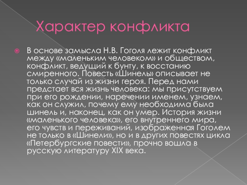 человеком» и обществом, конфликт, ведущий к бунту, к восстанию смиренного. Повесть «Шинель» описывает не только случай из жизни героя. Перед нами предстает вся жизнь человека: мы присутствуем при его рождении, наречении именем, узнаем, как он служил, почему ему необходима была шинель и, наконец, как он умер. История жизни «маленького человека», его внутреннего мира, его чувств и переживаний, изображенная Гоголем не только в «Шинели», но и в других повестях цикла «Петербургские повести», прочно вошла в русскую литературу XIX века.