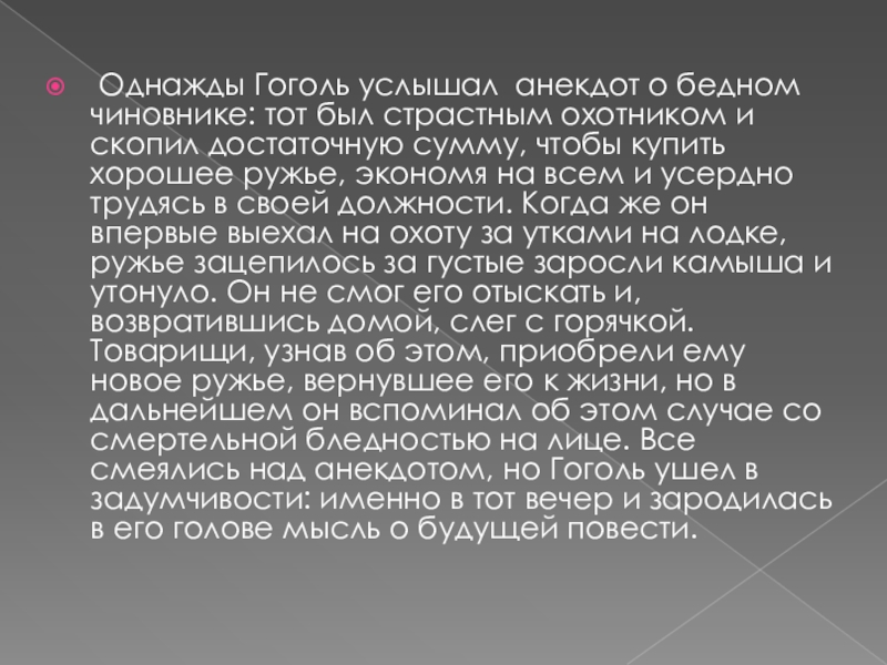 Слайд 4 Однажды Гоголь услышал анекдот о бедном чиновнике: тот был страстным