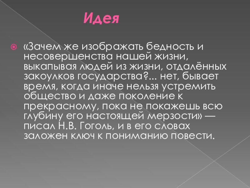 жизни, отдалённых закоулков государства?... нет, бывает время, когда иначе нельзя устремить общество и даже поколение к прекрасному, пока не покажешь всю глубину его настоящей мерзости» — писал Н.В. Гоголь, и в его словах заложен ключ к пониманию повести.