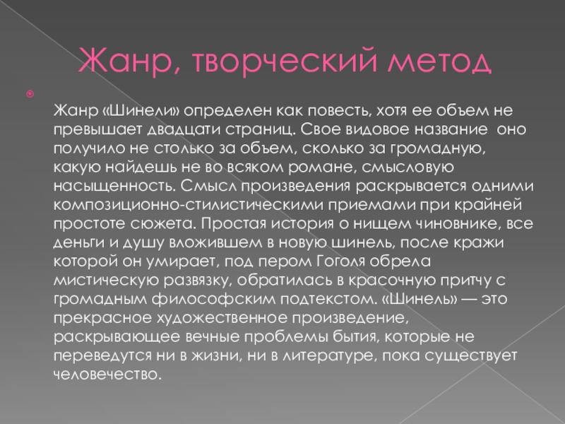 превышает двадцати страниц. Свое видовое название оно получило не столько за объем, сколько за громадную, какую найдешь не во всяком романе, смысловую насыщенность. Смысл произведения раскрывается одними композиционно-стилистическими приемами при крайней простоте сюжета. Простая история о нищем чиновнике, все деньги и душу вложившем в новую шинель, после кражи которой он умирает, под пером Гоголя обрела мистическую развязку, обратилась в красочную притчу с громадным философским подтекстом. «Шинель» — это прекрасное художественное произведение, раскрывающее вечные проблемы бытия, которые не переведутся ни в жизни, ни в литературе, пока существует человечество.