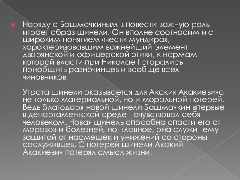 Слайд 15Наряду с Башмачкиным в повести важную роль играет образ шинели. Он