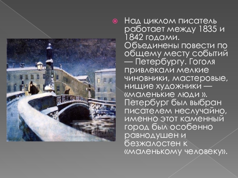 по общему месту событий — Петербургу. Гоголя привлекали мелкие чиновники, мастеровые, нищие художники — «маленькие люди ». Петербург был выбран писателем неслучайно, именно этот каменный город был особенно равнодушен и безжалостен к «маленькому человеку».