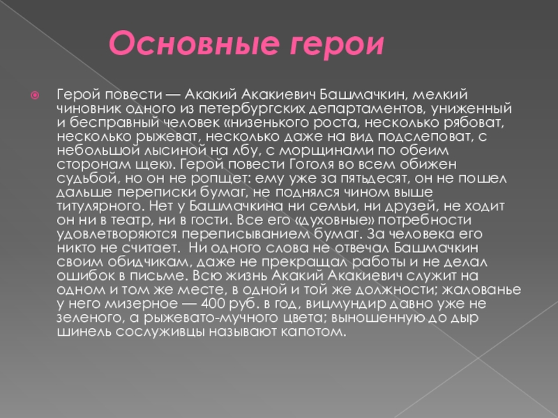 чиновник одного из петербургских департаментов, униженный и бесправный человек «низенького роста, несколько рябоват, несколько рыжеват, несколько даже на вид подслеповат, с небольшой лысиной на лбу, с морщинами по обеим сторонам щек». Герой повести Гоголя во всем обижен судьбой, но он не ропщет: ему уже за пятьдесят, он не пошел дальше переписки бумаг, не поднялся чином выше титулярного. Нет у Башмачкина ни семьи, ни друзей, не ходит он ни в театр, ни в гости. Все его «духовные» потребности удовлетворяются переписыванием бумаг. За человека его никто не считает. Ни одного слова не отвечал Башмачкин своим обидчикам, даже не прекращал работы и не делал ошибок в письме. Всю жизнь Акакий Акакиевич служит на одном и том же месте, в одной и той же должности; жалованье у него мизерное — 400 руб. в год, вицмундир давно уже не зеленого, а рыжевато-мучного цвета; выношенную до дыр шинель сослуживцы называют капотом.
