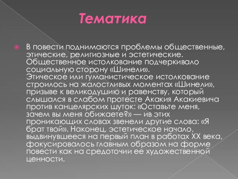 Этическое или гуманистическое истолкование строилось на жалостливых моментах «Шинели», призыве к великодушию и равенству, который слышался в слабом протесте Акакия Акакиевича против канцелярских шуток: «Оставьте меня, зачем вы меня обижаете?» — ив этих проникающих словах звенели другие слова: «Я брат твой». Наконец, эстетическое начало, выдвинувшееся на первый план в работах XX века, фокусировалось главным образом на форме повести как на средоточии ее художественной ценности.