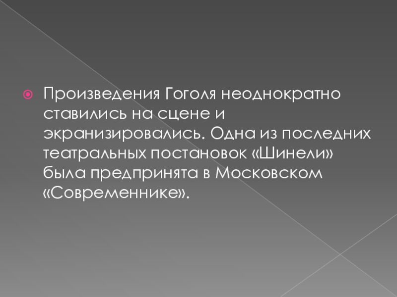 Слайд 17Произведения Гоголя неоднократно ставились на сцене и экранизировались. Одна из последних