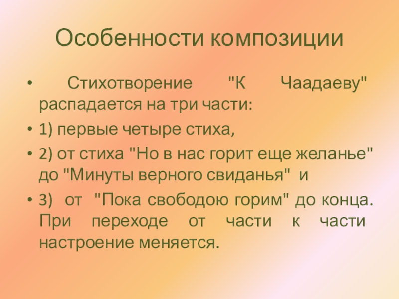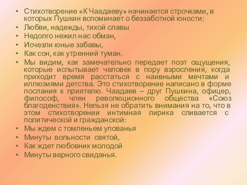Мы видим, как замечательно передает поэт ощущения, которые испытывает человек в пору взросления, когда приходит время расстаться с наивными мечтами и иллюзиями детства. Это стихотворение написано в форме послания к приятелю. Чаадаев – друг Пушкина, офицер, философ, член революционного общества «Союз благоденствия». Нельзя не обратить внимания на то, что в этом стихотворении интимная лирика сливается с политической и гражданской:
