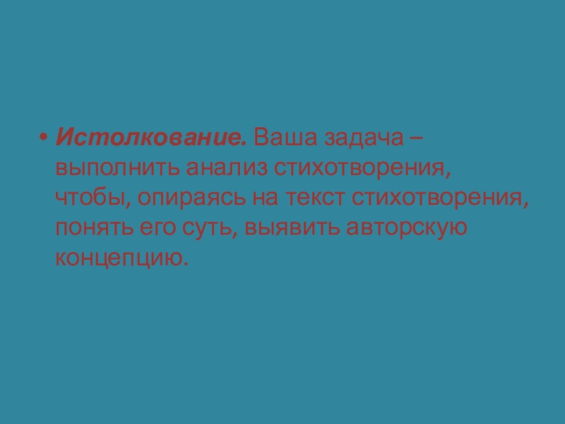 Слайд 6Истолкование. Ваша задача – выполнить анализ стихотворения, чтобы, опираясь на текст