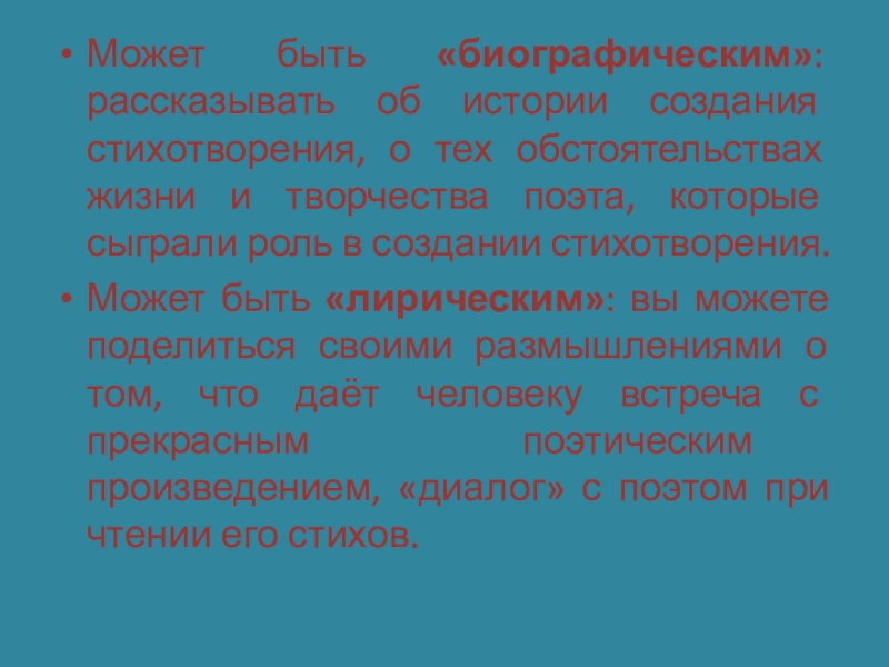 Слайд 3Может быть «биографическим»: рассказывать об истории создания стихотворения, о тех обстоятельствах