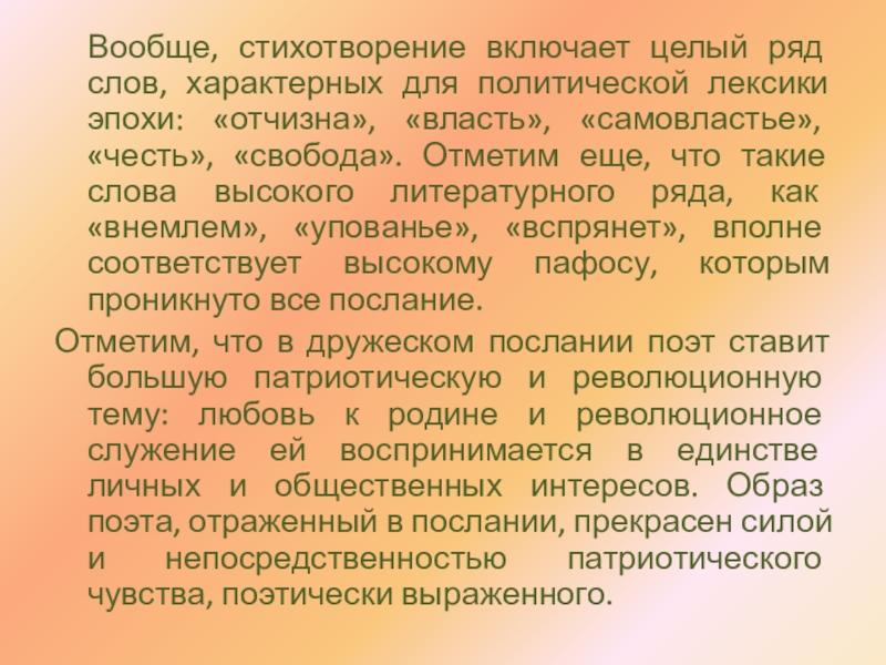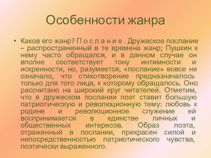е . Дружеское послание – распространенный в те времена жанр; Пушкин к нему часто обращался, и в данном случае он вполне соответствует тону интимности и искренности, но, разумеется, «послание» вовсе не означало, что стихотворение предназначалось только для того лица, к которому обращалось. Оно рассчитано на широкий круг читателей. Отметим, что в дружеском послании поэт ставит большую патриотическую и революционную тему: любовь к родине и революционное служение ей воспринимается в единстве личных и общественных интересов. Образ поэта, отраженный в послании, прекрасен силой и непосредственностью патриотического чувства, поэтически выраженного.