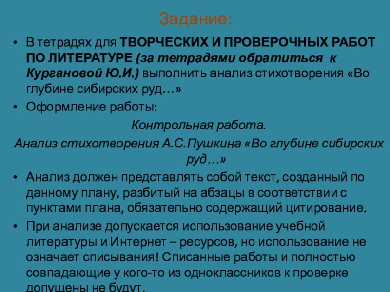 обратиться к Кургановой Ю.И.) выполнить анализ стихотворения «Во глубине сибирских руд…»
