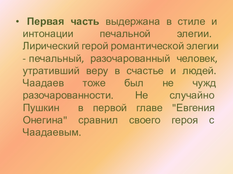 герой романтической элегии - печальный, разочарованный человек, утративший веру в счастье и людей. Чаадаев тоже был не чужд разочарованности. Не случайно Пушкин в первой главе "Евгения Онегина" сравнил своего героя с Чаадаевым.