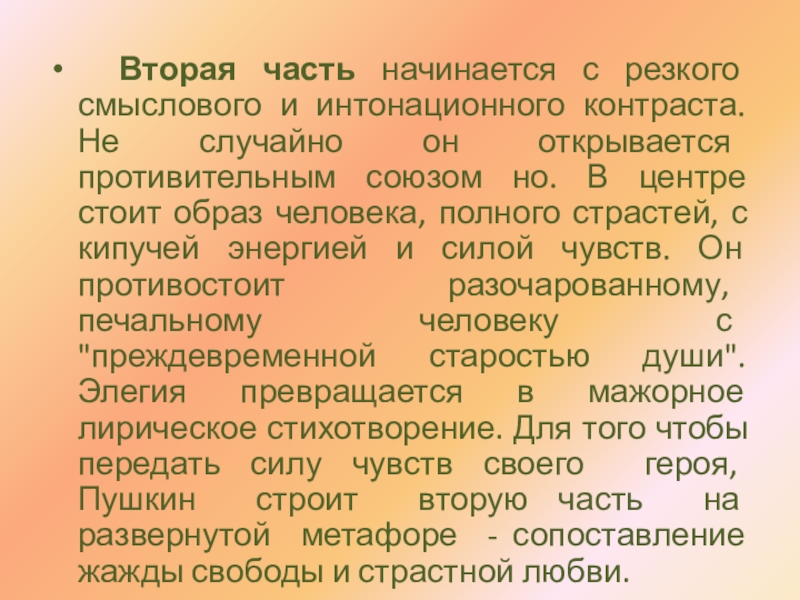 случайно он открывается противительным союзом но. В центре стоит образ человека, полного страстей, с кипучей энергией и силой чувств. Он противостоит разочарованному, печальному человеку с "преждевременной старостью души". Элегия превращается в мажорное лирическое стихотворение. Для того чтобы передать силу чувств своего героя, Пушкин строит вторую часть на развернутой метафоре - сопоставление жажды свободы и страстной любви.