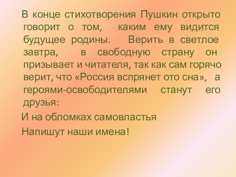 видится будущее родины. Верить в светлое завтра, в свободную страну он призывает и читателя, так как сам горячо верит, что «Россия вспрянет ото сна», а героями-освободителями станут его друзья: