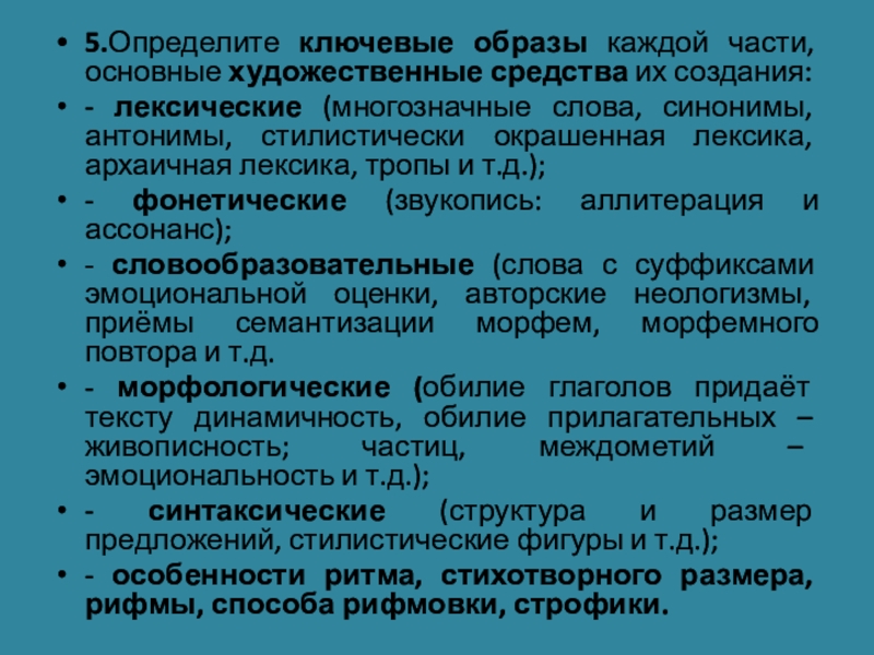 Слайд 165.Определите ключевые образы каждой части, основные художественные средства их создания: