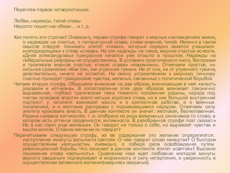 Как понять эти строчки? Очевидно, первая строфа говорит о мирных наслаждениях жизни, о надеждах на счастье, о литературной славе, славе мирной, тихой. Именно в таком смысле следует понимать эпитет «тихая», который нередко кажется учащимся «неподходящим» к слову «слава». Но эти надежды на тихое, мирное счастье исчезли. «Дней александровых прекрасное начало» уже отошло в прошлое. Надежды на либеральные реформы не осуществились. В условиях прлитического гнета, бесправия и произвола мирное счастье, «тихая слава» невозможны. Отмечаем простое, но сильное сравнение: «Как сон, как утренний туман». Ни от сна, ни от утреннего тумана, действительно, ничего не остается. На смену устремлениям к мирному личному счастью приходят гражданские чувства, желанья, связанные с политической борьбой.