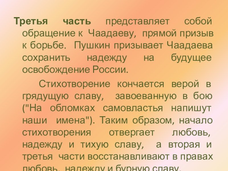 Слайд 15Третья часть представляет собой обращение к Чаадаеву, прямой призыв к борьбе.