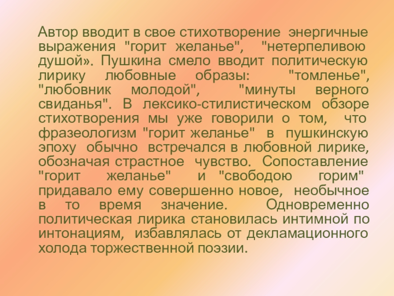 "нетерпеливою душой». Пушкина смело вводит политическую лирику любовные образы: "томленье", "любовник молодой", "минуты верного свиданья". В лексико-стилистическом обзоре стихотворения мы уже говорили о том, что фразеологизм "горит желанье" в пушкинскую эпоху обычно встречался в любовной лирике, обозначая страстное чувство. Сопоставление "горит желанье" и "свободою горим" придавало ему совершенно новое, необычное в то время значение. Одновременно политическая лирика становилась интимной по интонациям, избавлялась от декламационного холода торжественной поэзии.