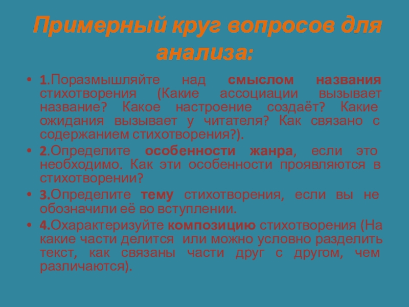 Обратите внимание на общее настроение стихотворения, на его эмоциональный фон, на ряд ассоциаций, возникающих при чтении, на звуковую и цветовую «палитру» стихотворения.