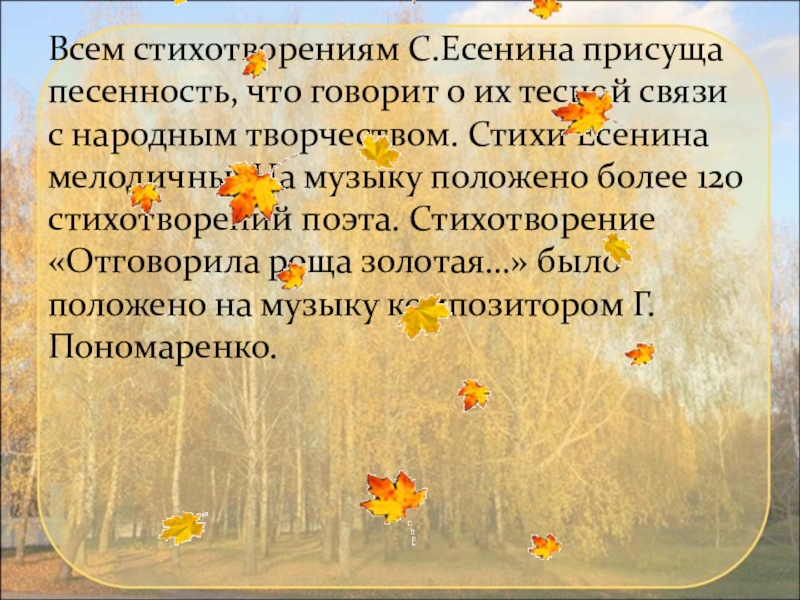 с народным творчеством. Стихи Есенина мелодичны. На музыку положено более 120 стихотворений поэта. Стихотворение «Отговорила роща золотая…» было положено на музыку композитором Г.Пономаренко.