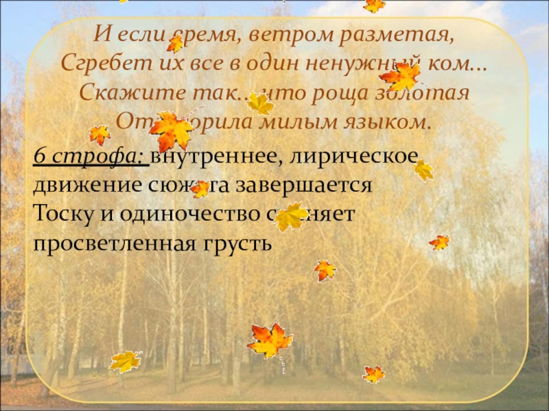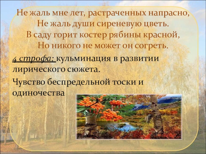 Слайд 11В стихотворении есть метафоры: отговорила роща… языком, души сиреневую цветь, горит