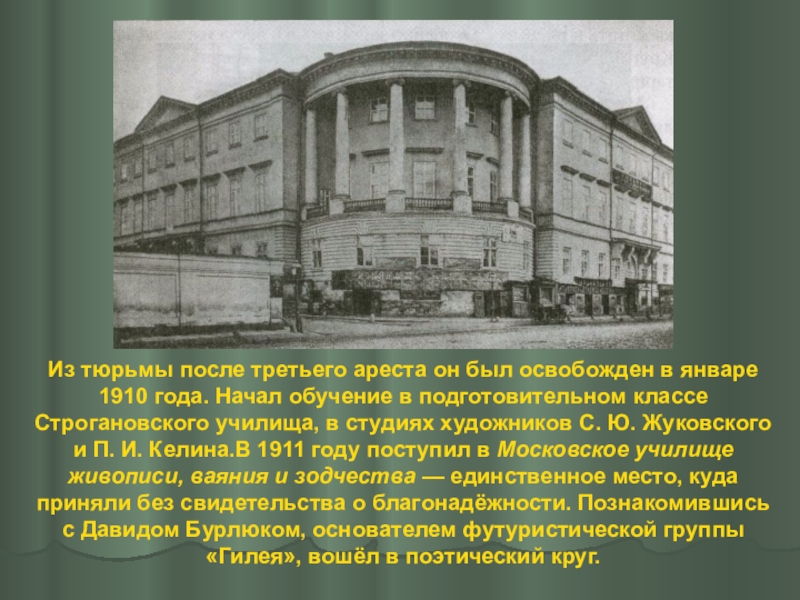 года. Начал обучение в подготовительном классе Строгановского училища, в студиях художников С. Ю. Жуковского и П. И. Келина.В 1911 году поступил в Московское училище живописи, ваяния и зодчества — единственное место, куда приняли без свидетельства о благонадёжности. Познакомившись с Давидом Бурлюком, основателем футуристической группы «Гилея», вошёл в поэтический круг.