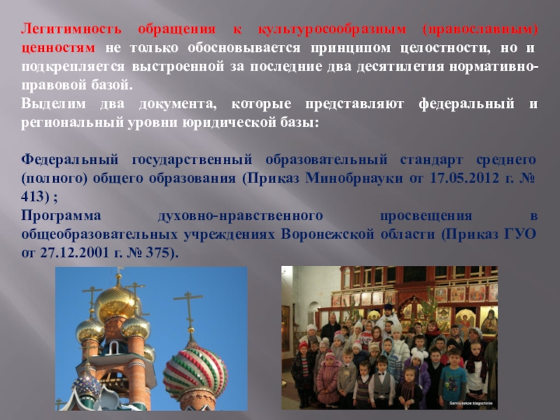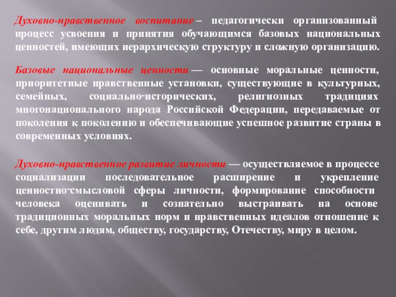 Базовые национальные ценности — основные моральные ценности, приоритетные нравственные установки, существующие в культурных, семейных, социально‑исторических, религиозных традициях многонационального народа Российской Федерации, передаваемые от поколения к поколению и обеспечивающие успешное развитие страны в современных условиях.