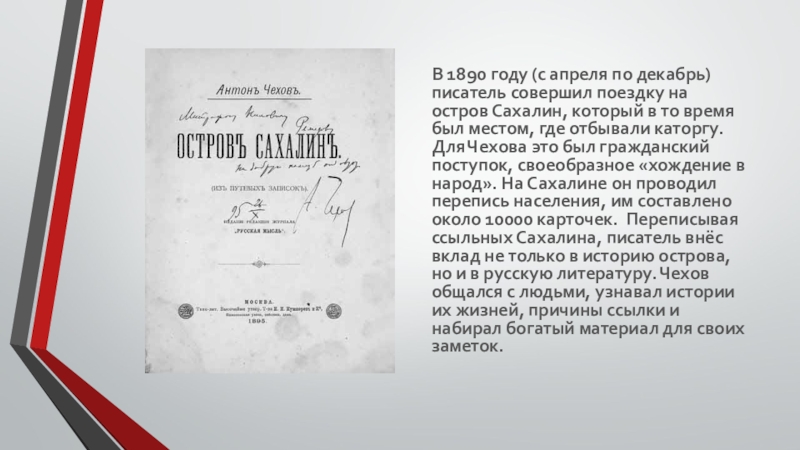 остров Сахалин, который в то время был местом, где отбывали каторгу. Для Чехова это был гражданский поступок, своеобразное «хождение в народ». На Сахалине он проводил перепись населения, им составлено около 10000 карточек. Переписывая ссыльных Сахалина, писатель внёс вклад не только в историю острова, но и в русскую литературу. Чехов общался с людьми, узнавал истории их жизней, причины ссылки и набирал богатый материал для своих заметок.