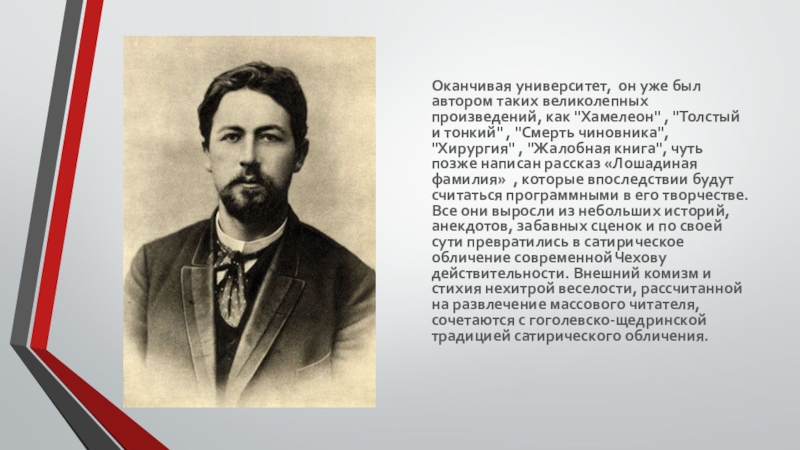 , "Толстый и тонкий" , "Смерть чиновника", "Хирургия" , "Жалобная книга", чуть позже написан рассказ «Лошадиная фамилия» , которые впоследствии будут считаться программными в его творчестве. Все они выросли из небольших историй, анекдотов, забавных сценок и по своей сути превратились в сатирическое обличение современной Чехову действительности. Внешний комизм и стихия нехитрой веселости, рассчитанной на развлечение массового читателя, сочетаются с гоголевско-щедринской традицией сатирического обличения.