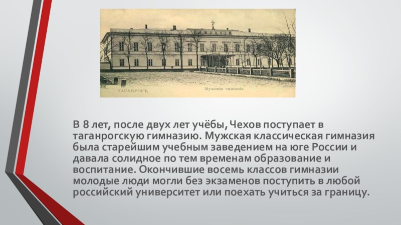 Слайд 7В 8 лет, после двух лет учёбы, Чехов поступает в таганрогскую