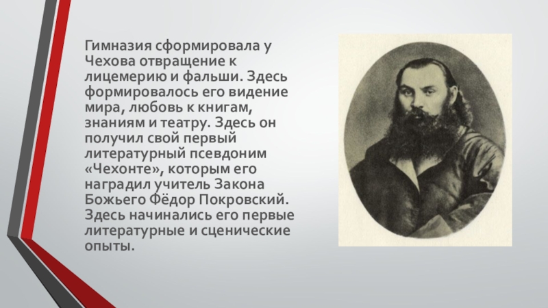 Слайд 8Гимназия сформировала у Чехова отвращение к лицемерию и фальши. Здесь формировалось