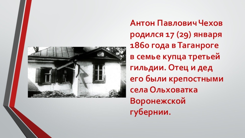 Слайд 2Антон Павлович Чехов родился 17 (29) января 1860 года в Таганроге