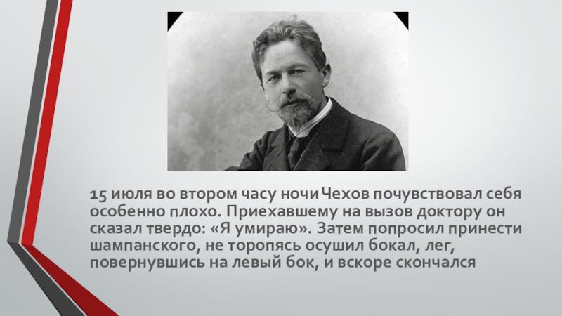 Слайд 2015 июля во втором часу ночи Чехов почувствовал себя особенно плохо.