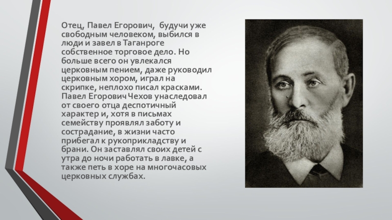 завел в Таганроге собственное торговое дело. Но больше всего он увлекался церковным пением, даже руководил церковным хором, играл на скрипке, неплохо писал красками. Павел Егорович Чехов унаследовал от своего отца деспотичный характер и, хотя в письмах семейству проявлял заботу и сострадание, в жизни часто прибегал к рукоприкладству и брани. Он заставлял своих детей с утра до ночи работать в лавке, а также петь в хоре на многочасовых церковных службах.