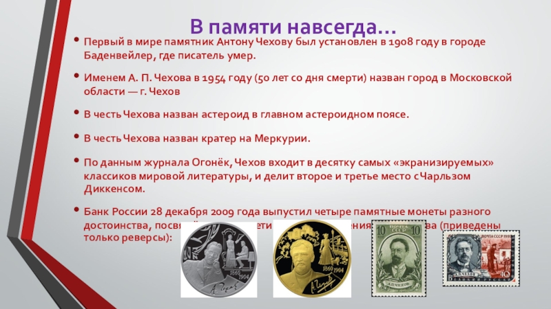 Банк России 28 декабря 2009 года выпустил четыре памятные монеты разного достоинства, посвящённые 150-летию со дня рождения А. П. Чехова (приведены только реверсы):