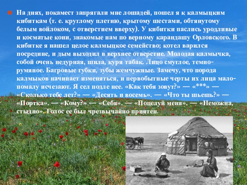 Слайд 2На днях, покамест запрягали мне лошадей, пошел я к калмыцким кибиткам