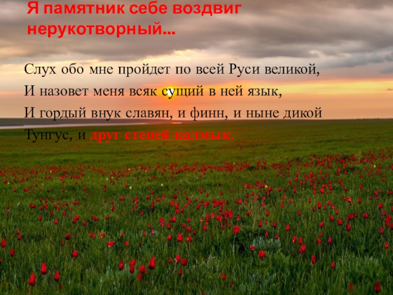 Я памятник себе воздвиг нерукотворный...Слух обо мне пройдет по всей Руси великой,И назовет меня всяк сущий в