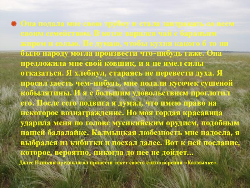 Далее Пушкин предполагал привести текст своего стихотворения «Калмычке».