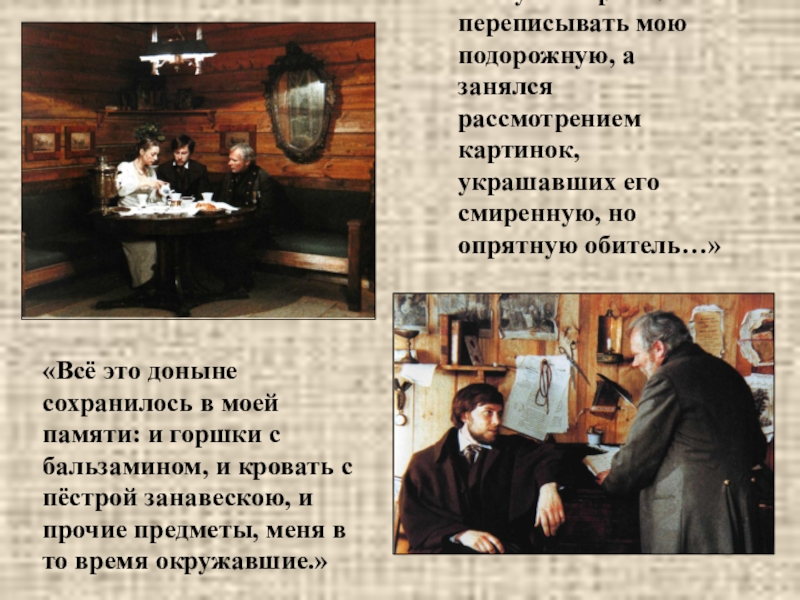 «Всё это доныне сохранилось в моей памяти: и горшки с бальзамином, и кровать с пёстрой занавескою, и прочие предметы, меня в то время окружавшие.»
